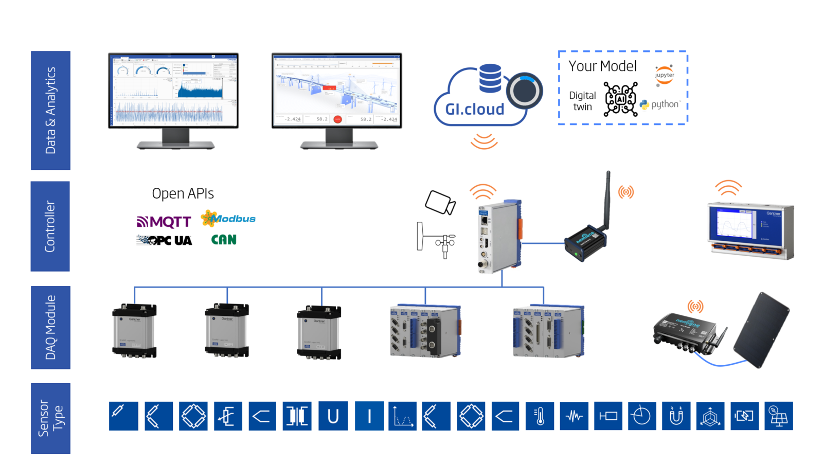 Gantner Instruments 提供 DAQ、边缘控制器、时间同步以及位于传感器和分析之间的集成层。传感器的选择、安装工程和解释通常由资产所有者、顾问或集成商负责,而 Gantner 则确保测量链产生可靠、可信的数据。
